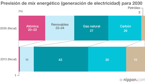 Esta falta de responsabilidad ante el problema nuclear del Gobierno de Japón queda claramente reflejada en la nueva previsión de oferta y demanda energética a largo plazo fijada en julio de este año. El mix energético de generación de electricidad para 2030 queda fijado por el Gobierno de la siguiente forma: nuclear, 20-22 %; renovables, 22-24 %; térmica alimentada con gas natural líquido, 27 %; térmica alimentada con carbón, 26 %; térmica alimentada con petróleo, 3 %.