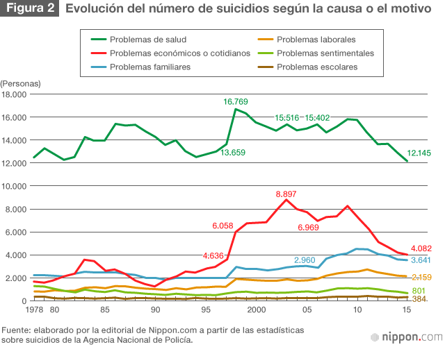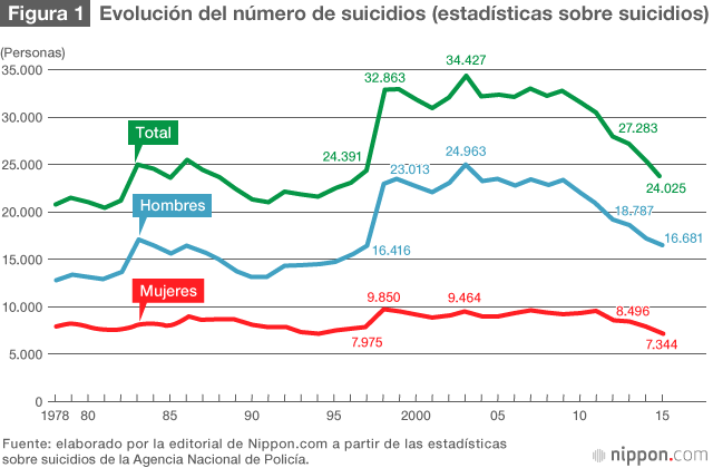 Tras más de un decenio sobrepasando los 30.000 casos anuales de suicidios, en 2012 la cifra inició un decidido descenso. Según las estadísticas de 2015, datos más recientes disponibles, el número de suicidios de aquel año fue de 24.025. A pesar de que supone una mejora ostensible respecto al pico alcanzado anteriormente, la cifra tan solo se acerca a los niveles anteriores al drástico aumento de 1998. En 2015 el número de defunciones por suicidio fue 5,8 veces mayor que de las debidas a accidentes de tráfico (4.117). No podemos afirmar, pues, que el número de suicidios se haya reducido lo suficiente todavía.