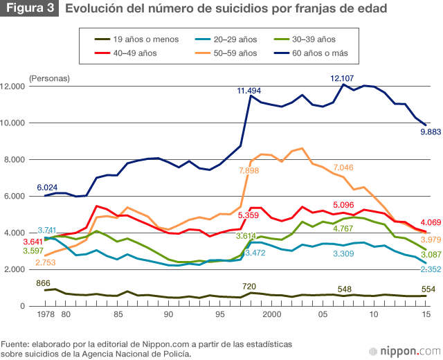 El incremento de los suicidios de hombres en la cuarentena y la cincuentena, la edad más productiva laboralmente, resultó especialmente grave. Este agudo crecimiento de la tasa de suicidio entre los hombres de mediana edad iniciado a finales de los años noventa, en contraste con la tendencia mundial a la proliferación del suicidio de los hombres jóvenes ante cambios sociales bruscos, constituye un rasgo peculiar del caso nipón.