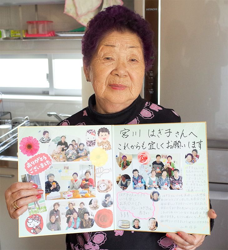Miyakawa Hakiko recibió de sus vecinos una tarjeta con mensajes antes de abandonar la vivienda provisional donde vivía. “Aún no he superado la tristeza de perder mi hogar en el tsunami, pero he podido seguir adelante con el apoyo de mis vecinos”.