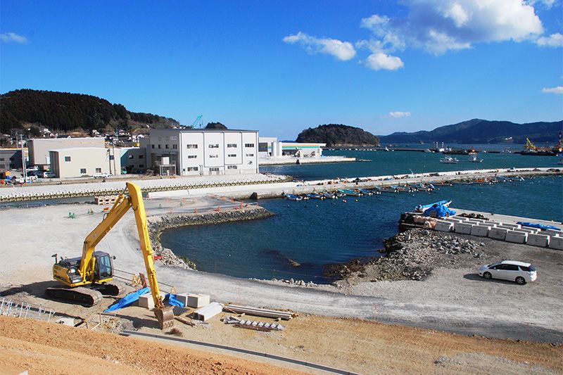 El puerto de Shizugawa bañado por las tranquilas aguas del mar. Las obras para la reconstrucción del puerto continúan y hay nuevos edificios.