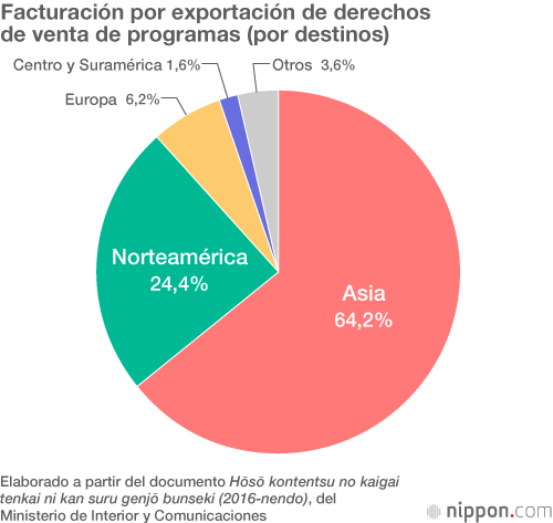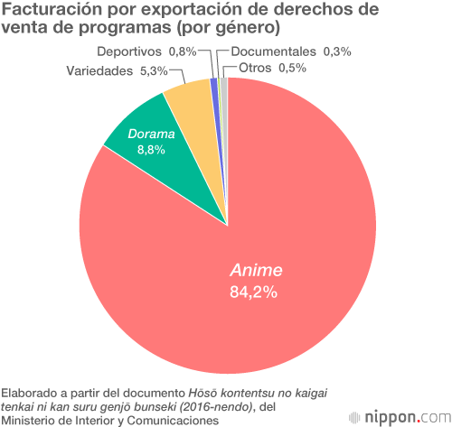 Según un análisis hecho público en junio de 2018 por el Ministerio de Interior y Comunicaciones, del conjunto de lo facturado durante el año fiscal 2016 en concepto de exportación de programas (derechos de emisión, distribución por internet, y producción de videos y DVD), el anime (dibujos animados japoneses) representaba el 80 %, seguido por el dorama (seriales o telenovelas japonesas) y los programas de variedades. En el caso de los dorama, interpretados por actores de carne y hueso, las particularidades del idioma japonés representan un gran obstáculo, pero la animación es un género en el que esa barrera puede franquearse más fácilmente. Por otra parte, se advierte que los principales destinos de las exportaciones son Asia y Norteamérica. A continuación haré un repaso de los diversos géneros.