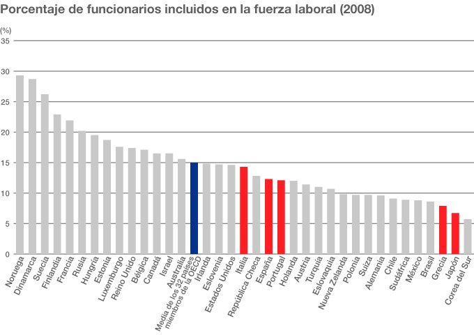 El porcentaje de funcionarios en relación a la fuerza laboral de los cuatro países, aunque alto en comparación con el 6,7% de Japón, es inferior a la media de los países de la OECD -el 15%- (2000-2008): Italia es el de mayor porcentaje, con un 14,3%, seguido de España con un 12,3%, Portugal con un 12,1% y Grecia con un 7,9% (OECD, 2011). Sin embargo, si nos fijamos en los detalles, salta a la vista una ineficacia en el uso de los recursos humanos.