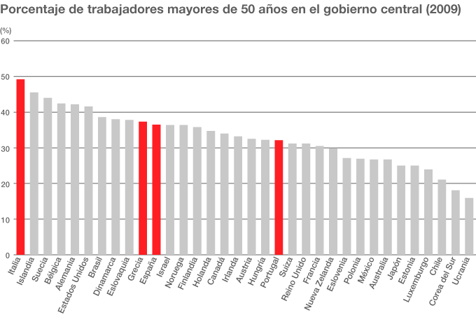 Como tercer punto se puede señalar que hay muchos burócratas de salarios altos y de edad avanzada. Casi todos los países miembros de la OECD muestran una tendencia a contar con un alto porcentaje de trabajadores de más de cincuenta años de edad, pero especialmente en Italia, con un 49,2%, en Grecia, con un 37,3%, en España, con un 36,5%, y en Portugal, con un 32,1% (OECD, 2011). Esta proporción, en lo sucesivo, no hará más que aumentar aún más al limitar la contratación de nuevos funcionarios para intentar reducir el gasto público. En España, por ejemplo, dado que no se renuevan los cargos, están tratando de reducir el porcentaje de trabajadores públicos a un 10%, desde el 12,3% que representan ahora en la fuerza laboral. A tal efecto no van a contratar a nuevos funcionarios no formales hasta 2013, y el reclutamiento de diplomáticos, funcionarios del gobierno central y funcionarios de los gobiernos autonómicos ha quedado congelado durante estos dos años.