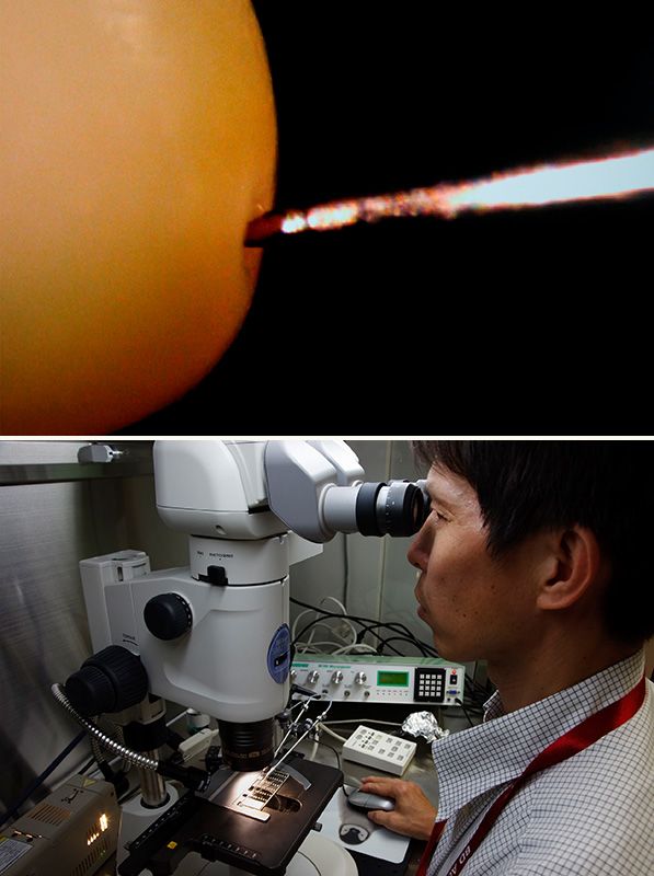 Los huevos de gusano de seda son de aproximadamente 1 mm de diámetro. Se requiere una gran habilidad para inyectar ADN en la parte del huevo que se diferencia en células germinales (foto superior). El investigador jefe Uchino Keirō introduciendo ADN en un huevo con la ayuda de un microscopio (foto inferior).