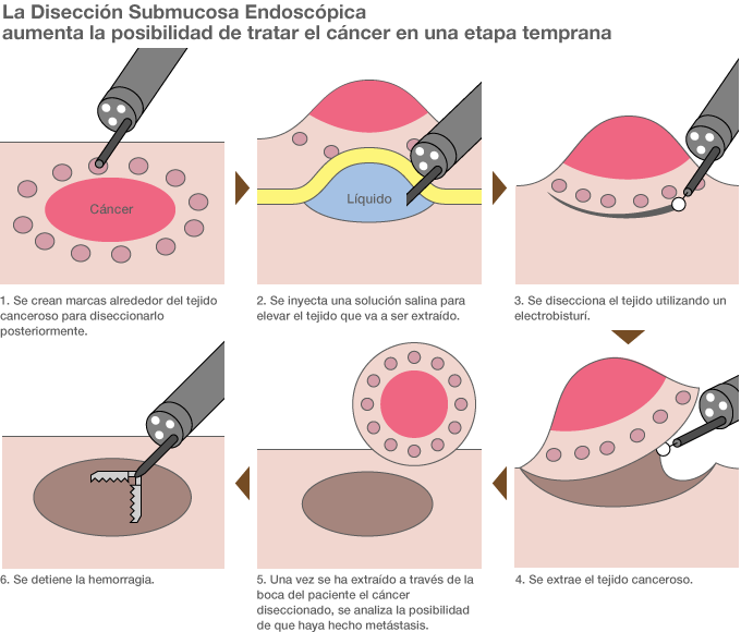 La Disección Submucosa Endoscópica es una nueva técnica que se realiza con la ayuda del endoscopio. En la antigua técnica de la Resección Mucosa Endoscópica se utilizaba un instrumento con el que se rodeaba con un lazo el tumor para después cortarlo, pero esta técnica estaba limitada por el tamaño del tumor. En cambio, con la Disección Submucosa Endoscópica se pueden cortar tumores de más de dos centímetros utilizando el bisturí endoscópico. En Japón, uno de cada cuatro pacientes con cáncer de estómago es ya intervenido con una Disección Submucosa Endoscópica. Fuente: Gan o kirazu ni naosu naishikyō chiryō ESD ga wakaru hon (Cómo tratar el cáncer sin diseccionarlo a través de la endoscopia, Kodansha).