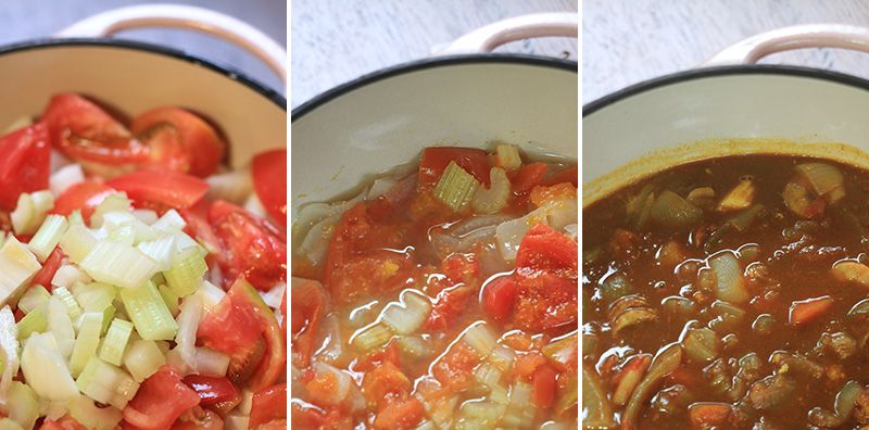 A la izquierda, los ingredientes se cocinan a fuego lento en la olla. En el centro, se puede ver cómo una hora más tarde, rezuman agua. Por último, si se le añade una base de curry compuesta de salsa y mantequilla y se cuece un poco, el plato estará listo para servir.