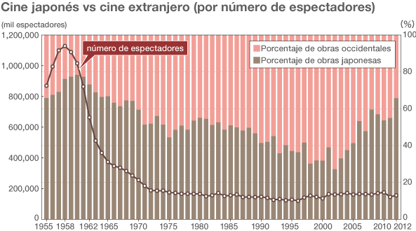 Según las estadísticas de la Asociación de Productores de Cine de Japón, las 983 películas que se estrenaron en 2012 supusieron un gran cambio respecto al año anterior. La tasa de crecimiento del cine japonés es especialmente alta, y sus cifras continúan arrinconando al cine occidental. En taquilla, Japón ya casi ha logrado doblar los beneficios de las obras occidentales. Si comparamos los datos con los del año pasado, veremos que el cine occidental ha caído un 17.9%, frente al crecimiento del 28.2% que ha experimentado el cine japonés.