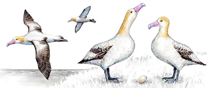Albatros de cola corta. Muchas de estas aves se reprodujeron en islas como las del archipiélago de Ogasawara, Torishima y las Senkaku, pero cinco millones de ejemplares fueron asesinados por su plumaje. Durante un tiempo se temió que esta especie se extinguiera. Sin embargo, los esfuerzos de conservación han evitado la tragedia. Desde 1962 es Monumento Natural Especial. Ilustración de Iizuka Tsuyoshi.