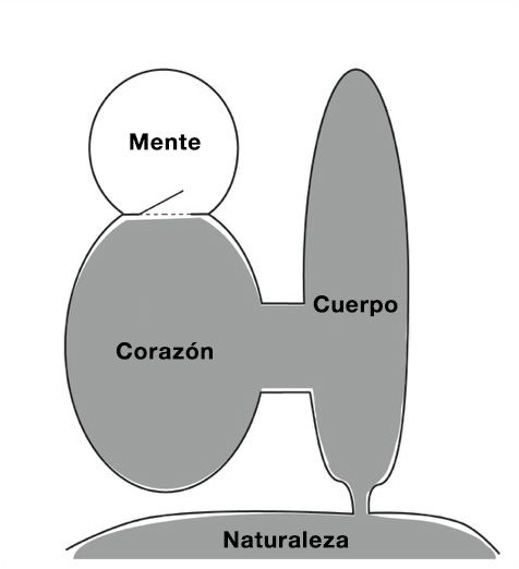 Las personas poseemos una estructura híbrida. Por un lado, tenemos una base de corazón=cuerpo que compartimos con el resto de los animales y está compuesta por unos principios salvajes que proceden de la naturaleza. Por el otro, el proceso evolutivo añadió a esa base una mente encargada de procesar información que no responde a los principios naturales.
