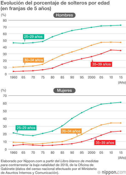 Uno de cada dos hombres y una de cada tres mujeres: esa es la proporción de solteros en la población de entre 30 y 34 años en Japón. Una encuesta efectuada en 2015 y publicada en el Libro blanco de medidas para contrarrestar la baja natalidad de 2018, de la Oficina de Gabinete, reveló que un 47,1 % de los hombres y un 34,6 % de las mujeres en dicha franja de edad no estaban casados. En el tramo de 35 a 39 años, la relación de solteros era del 35 % (uno de cada tres) de los hombres y del 23,9 % (una de cada cuatro) de las mujeres.