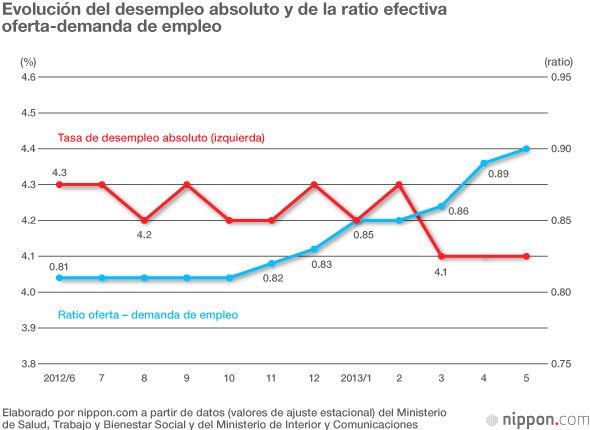Si observamos la evolución de los indicadores económicos durante el último año, con el traspaso de poder del Partido Democrático de Japón al Partido Liberal Democrático en diciembre, la aplicación de la referida flexibilización cuantitativa y otros hechos, el índice Nikkei ha comenzado a mostrar una tónica ascendente y en el mercado de divisas se ha fortalecido la tendencia a corregir el alza del yen. Son palpables también la tendencia a la baja mostrada por el índice de desempleo absoluto y la tendencia inversa que se aprecia en la ratio efectiva oferta-demanda de empleo. Y si atendemos al índice del juicio sobre el ambiente de negocios (un índice de difusión en el que se restan las respuestas negativas de las positivas) de la encuesta Tankan (encuesta de observación económica a corto plazo para las empresas del país) del Banco de Japón, que mide la confianza empresarial, vemos igualmente una mejora en las expectativas, principalmente entre las grandes empresas.