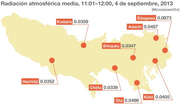 Una de las preocupaciones que asaltan a muchos de los visitantes de Tokio es la presencia de radiación procedente del accidente de la central nuclear de Fukushima Daiichi, ocasionado por el terremoto y tsunami del 11 de marzo de 2011. El Instituto Metropolitano de Salud Pública de Tokio realiza con regularidad mediciones y publica el nivel de radiactividad en la atmósfera, agua potable, y precipitaciones atmosféricas (incluyendo lluvia y partículas). Mediciones recientes en varias áreas de Tokio indican que el índice de radiación absorbida está por debajo de 1 milisievert por año, el nivel estándar de radiactividad natural definido como aceptable para las metrópolis.