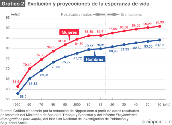Según el informe Proyecciones demográficas para Japón, publicado en enero de 2012 por el Instituto Nacional de Investigación de Población y Seguridad Social, la población anciana crecerá también en el futuro, y en 2042 alcanzará su máximo al llegar a 38.780.000 personas. Aunque esta disminuirá posteriormente, el índice de envejecimiento aumentará. Por consiguiente, este índice será del 39,9 % en 2060, y una de cada 2,5 personas tendrá más de 65 años; la proporción de habitantes mayores de 75 años llegará al 26,9 %, de modo que una de cada cuatro personas pertenecerá a esta franja de edad. Se estima que la esperanza de vida de los hombres será de 84,19 años; la de las mujeres, 90,93 años.