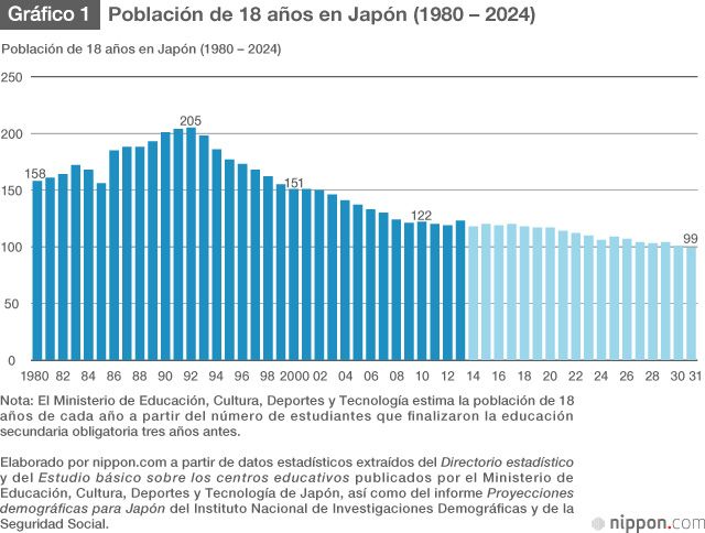 Según el Estudio básico sobre las universidades del Ministerio de Educación, Cultura, Deportes, Ciencia y Tecnología, la población de 18 años de Japón alcanzó su pico en 1966 con 2.490.000 jóvenes que habían nacido en el baby boom de la posguerra. Aunque en el descenso posterior hubo una recuperación temporal, la cifra pasó de los 2.050.000 jóvenes de 18 años en 1992 —hijos de los nacidos en el baby boom— a tan solo 1.180.000 en 2014. Aunque la población de 18 años se ha mantenido estable en los últimos años, el Instituto Nacional de Investigaciones Demográficas y de la Seguridad Social prevé que en 2018 volverá a iniciarse un fuerte declive que para 2031 dejará la cifra por debajo del millón, con solo 990.000 jóvenes de 18 años.