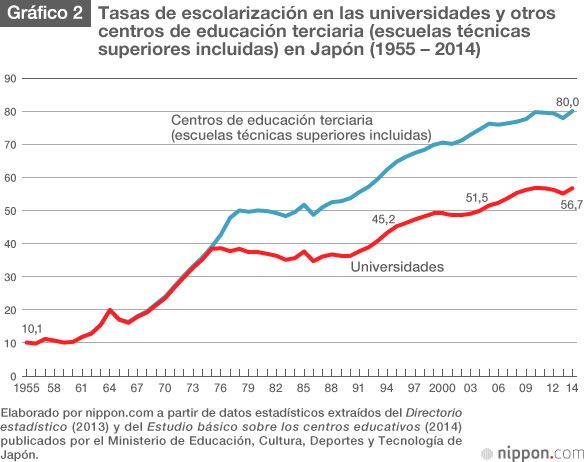 Veamos ahora la evolución de la tasa de escolarización universitaria. Incluyendo a los estudiantes de grados universitarios largos y cortos, en las décadas de los setenta y los ochenta la tasa era de entre un 36 % y un 37 %. En 1995 la tasa alcanzó el 45,2 %, en 2005 creció hasta el 51,5 % y llegó al 56,7 % en 2014. Si incluimos las escuelas técnicas superiores, la tasa de 2014 asciende al 80 %. Hablamos de una generación altamente educada en la que una de cada dos personas accede a estudios universitarios. Dicho de otro modo, desde el año 2000 Japón vive una “era de excedente de plazas universitarias” en la que cualquiera puede ingresar en la universidad (mientras no limite sus opciones a una universidad o unos estudios concretos).