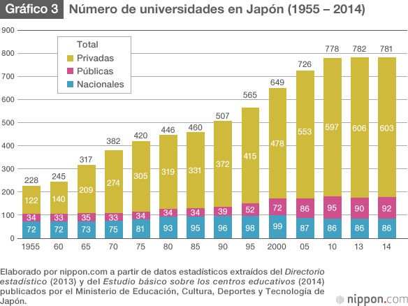 En el trasfondo de la difícil situación actual está la rápida proliferación de nuevas universidades que tuvo lugar a partir de los años noventa. En esos años se aplicó una enmienda sustancial a la Normativa para el establecimiento de las universidades (Daigaku secchi kijun) que relajó los criterios para aprobar la constitución de centros universitarios, lo que resultó en la creación de una serie de departamentos y planes de estudios nuevos y en la modificación de algunos de los ya existentes. Mientras que en los noventa Japón contaba con unas 500 universidades —entre nacionales, públicas y privadas—, actualmente la cifra se eleva hasta 780. La confluencia del aumento del número de universidades y la reducción del 40 % de la población de 18 años respecto a los años noventa es lo que ha desencadenado la actual sobreoferta de plazas.