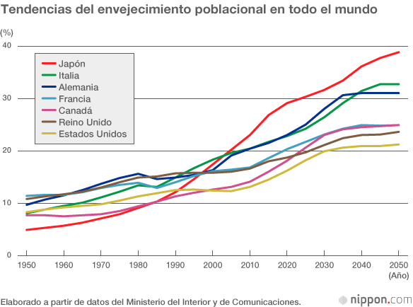 Japón, una sociedad superenvejecida en la que la natalidad no deja de caer, se enfrenta al descenso de su población. Según la edición de 2014 del Libro blanco sobre la sociedad envejecida, el número total de habitantes descenderá hasta los 100 millones en 2050; una década después, podría situarse por debajo de los 90 millones. En la actualidad, el país continúa sufriendo un descenso de su población en edad de trabajar: la proporción de personas mayores de 65 años por cada 100 habitantes en edad de trabajar es de 42, una cifra que a comienzos de 2023 podría aumentar hasta 50. En lo que respecta a la seguridad social, nos estamos acercando a una época en la que por cada jubilado solo haya dos trabajadores para hacerse cargo de su pensión.