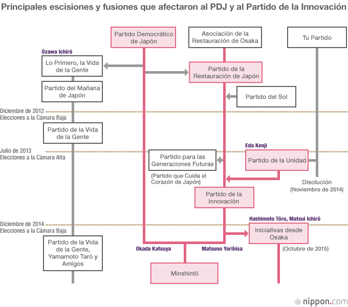 Desde 2012, cuando el Gobierno del PDJ se encontraba ya en su última fase, se ha producido una serie de fusiones y escisiones que afectan tanto al PDJ como al llamado “tercer polo” (el resto de los partidos, excluyendo el PLD y el Kōmeitō, que forman la actual coalición gubernamental). Pero de todos estos procesos no ha salido fortalecido, prácticamente, ningún partido. Tu Partido (Minna no Tō) quedó disuelto y el Partido de la Innovación perdió gran parte de su presencia política a consecuencia de la escisión de la sección de Osaka, que estuvo encabezada por el fundador del partido, el exalcalde de esa ciudad Hashimoto Tōru.