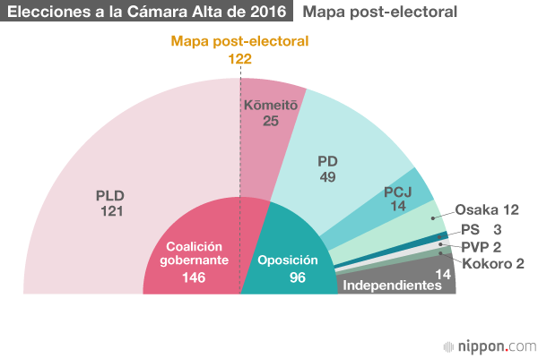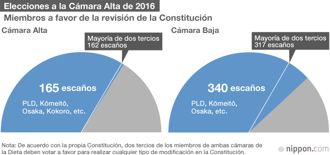 Los resultados de las elecciones a la Cámara Alta del 10 de julio de 2016 han abierto la puerta a una potencial modificación de la Constitución ahora que la coalición gobernante, los partidos y los políticos que supuestamente apoyan esta propuesta han pasado a dominar dos tercios del total de los escaños. De los 121 asientos en disputa en las elecciones del domingo 10 de julio, la coalición gobernante del Partido Liberal Democrático y el Kōmeitō obtuvieron 56 y 14 escaños respectivamente, consiguiendo un total de 70. Con esto se ha alcanzado el objetivo del primer ministro Abe Shinzō de ganar una mayoría de los asientos en estas elecciones.