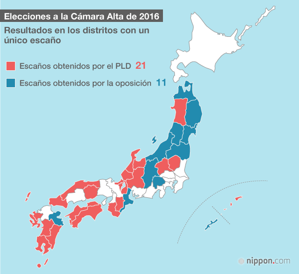 Abajo se ofrecen los resultados de los 32 distritos en los que solo podía salir elegido un candidato y donde el PLD se enfrentó a la coalición de cuatro partidos de la oposición. El PLD obtuvo 21 de esos escaños, con la oposición obteniendo los 11 asientos restantes. Estos resultados reflejan cierto avance de la oposición en comparación con 2013, cuando el PLD obtuvo casi una victoria absoluta con 29 escaños. El ministro de Justicia Iwaki Mitsuhide fue derrotado en Fukushima, mientras que la ministra Shimajiri Aiko de Okinawa no fue reelegida en su prefectura.