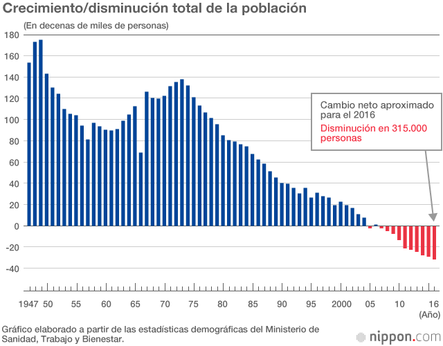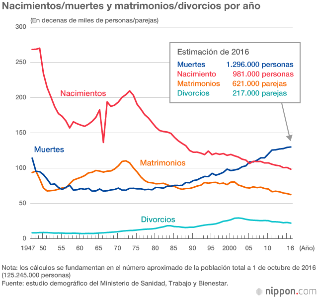 En 2016 se registraron aproximadamente 1.296.000 muertes en Japón, la mayor cifra desde que terminase la Segunda Guerra Mundial. Esto ha tenido como resultado un descenso general de la población en 315.000 personas, señalando un aumento en el ritmo de decrecimiento demográfico en Japón.