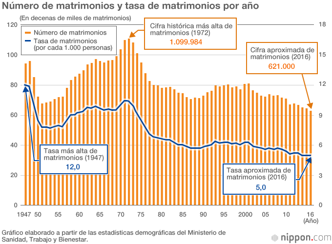El número aproximado de matrimonios en 2016 fue de 621.000, con un descenso cercano a los 9.000 respecto al año interior. Esta es la cifra más baja de matrimonios registrada desde el final de la Segunda Guerra Mundial, con solo 10 personas contrayendo matrimonio por cada 1.000 personas.