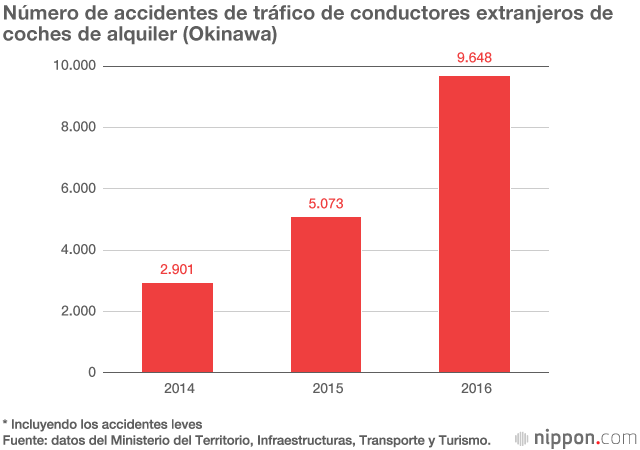 La Asociación de Empresas de Alquiler de Vehículos de la prefectura de Okinawa asegura que el número de accidentes de tráfico en los que se vieron involucrados conductores extranjeros de coches de alquiler en la prefectura, incluyendo los accidentes leves sin daños personales, aumentaron hasta alrededor de 9.600 casos en 2016. Esto es debido a que en muchos países vecinos como Corea del Sur o Taiwán se conduce por la derecha, una norma que es diferente en Japón, donde se conduce por la izquierda. Esto hace que los conductores extranjeros a menudo se confundan. “Este es uno de los principales desencadenantes de leves accidentes de circulación” explica un dependiente de un local de alquiler de vehículos.