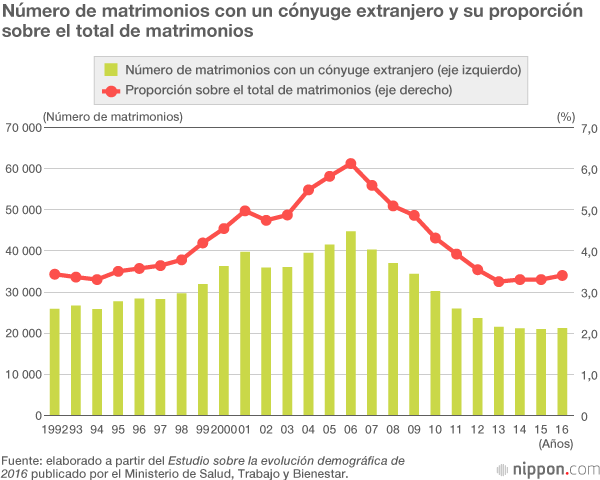 El Estudio sobre la evolución demográfica de 2016 elaborado por el Ministerio de Salud, Trabajo y Bienestar reveló que en dicho año el número de matrimonios internacionales, los matrimonios en los que uno de los cónyuges tiene nacionalidad extranjera, fue de 21.180. Ese mismo año el número total de matrimonios en Japón fue de 620.531, lo que quiere decir que 1 de cada 29 matrimonios fue internacional.