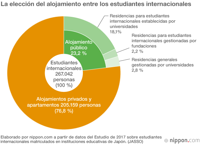 Datos de un estudio estadístico de la Organización Japonesa de Servicios para Estudiantes (JASSO, por sus siglas en inglés) realizado en el año fiscal 2017 revelan que solo un 23,2 % de los estudiantes extranjeros que llegaron a Japón se alojaban en residencias establecidas por las universidades, dormitorios para estudiantes internacionales u otras residencias gestionadas por fundaciones, mientras que una mayoría del 76,8 %, 205.159 estudiantes, se vieron obligados a vivir en alojamientos privados o alquilar sus propios apartamentos.