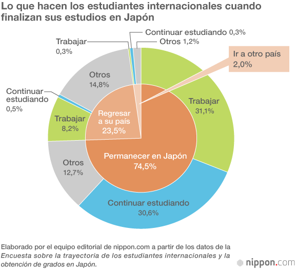 Los resultados de la Encuesta sobre la trayectoria de los estudiantes internacionales y la obtención de grados en Japón publicados en febrero por la Organización Japonesa de Servicios para Estudiantes (JASSO, por sus siglas en inglés) revelan que entre abril de 2016 y marzo de 2017 alrededor de un 74,5 % de los estudiantes que finalizaron sus estudios en universidades, escuelas de posgrado y escuelas profesionales (sin contar los matriculados en escuelas de enseñanza del japonés) decidieron permanecer en Japón trabajando o continuando sus estudios. El 23, 5 % restante regresó a su lugar de origen, y un 2 % se trasladó a otro país.