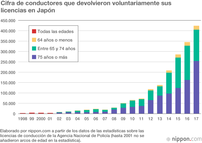 Un creciente número de personas de la tercera edad en Japón están devolviendo de forma voluntaria sus licencias de conducir. En 1998 se introdujo un nuevo sistema como respuesta al envejecimiento de la población japonesa, pero solo a partir del 2012 el número de conductores de avanzada edad que decidieron entregar sus permisos comenzó a aumentar de forma notable. El número de personas que han animado a las personas mayores directamente o a través de sus familias a entregar las licencias también ha ido aumentando entre la sociedad. Esta tendencia ha surgido como respuesta a los frecuentes accidentes de tráfico graves provocados por conductores de la tercera edad, como el atropello de peatones al confundir el pedal del acelerador con el del freno o accidentes provocados por conductores que viajaban en el sentido erróneo en la autopista.
