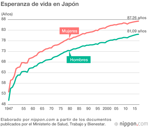 De acuerdo con los datos de 2017 del Ministerio de Salud, Trabajo y Bienestar, la esperanza de vida media en Japón es de 81,09 años para los hombres y de 87,26 para las mujeres. Ambas cifras son las más altas registradas hasta el momento. Cuando se comenzaron a reunir estadísticas sobre la esperanza de vida en 1947, poco después del final de la Segunda Guerra Mundial, la tasa era de 50,06 años para los hombres y 53,96 para las mujeres. No obstante, las mejoras en la salud pública, las innovaciones en los tratamientos médicos y el aumento de la concienciación sobre la salud han favorecido este rápido incremento de la esperanza de vida. Este es el sexto año consecutivo para los hombres y el quinto para las mujeres en el que las cifras han alcanzado nuevos máximos históricos.