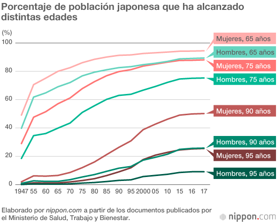 De los nuevos ciudadanos japoneses de 2017, se espera que el 89,4 % de los niños y el 94,5 % de las niñas vivan hasta los 65 años. Por otra parte, el 25,8 % de los niños y el 50,2 % de las niñas alcanzarán los 90 años. Du Fu, el poeta chino de la dinastía Tang, escribió que “Vivir hasta los setenta años siempre ha sido una rareza”. No obstante, esto ya no es más que una extraña ocurrencia.