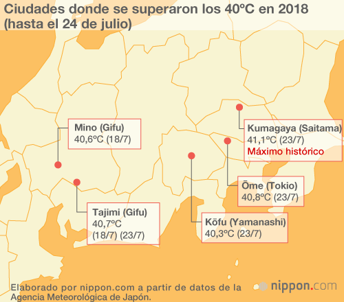 El archipiélago japonés está sufriendo días de calor sofocante. La Agencia Meteorológica de Japón informó que en la tarde del 23 de julio la ciudad de Kumagaya de la prefectura de Saitama registró una temperatura récord de 41,1 grados centígrados, superando la temperatura más alta registrada en el país hasta entonces hace 5 años. La ciudad de Ōme en Tokio registró también el mismo día una temperatura récord de 40,8ºC. En la capital se superaron por primera vez en la historia los 40ºC. Por otra parte, la ciudad de Tajimi en la prefectura de Gifu alcanzó los 40,7ºC los días 18 y 23 de julio.