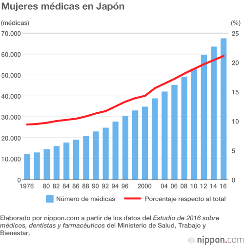 En 2016 el número de médicas en Japón era de 67.493, un 21,1 % de todos los doctores en Japón. En comparación con las cifras de la década de 1970, cuando representaban menos del 10 %, este porcentaje ha mejorado, pero la brecha de género es aún muy pronunciada en la medicina japonesa.
