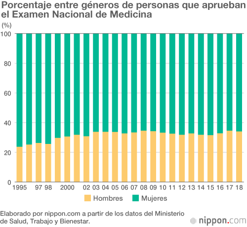 La proporción de mujeres que aprueban el Examen Nacional de Medicina respecto a los hombres es de 3 por cada 7, pero el porcentaje de médicas es en realidad aún menor debido a la brecha de género si tenemos en cuenta las contrataciones después de que estas se hayan registrado oficialmente como doctoras. Japón sigue siendo un país en el que, aun hoy, las ideas sobre los “roles de género” siguen teniendo mucha fuerza. En particular, las mujeres desempeñan un papel central en la crianza de los hijos después de dar a luz. De acuerdo con una encuesta de 2016 realizada por el Ministerio de Salud, Trabajo y Bienestar, el 28 % de las médicas empleadas a tiempo completo en hospitales pasaban más de 60 horas a la semana en su puesto, incluyendo el tiempo dedicado a atender a pacientes, realizar otro tipo de tareas y esperar entre turnos. Esta situación, que dificulta el equilibrio entre el trabajo y la crianza de los hijos, es uno de los factores que parecen influir en el bajo porcentaje de médicas en Japón.