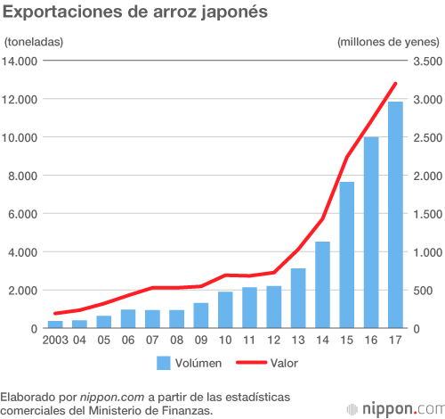 En 2007 Japón exportó 940 toneladas de arroz pulido, una cifra que aumentó en 12,5 veces en la siguiente década hasta las 11.841 toneladas de 2017. Aunque este aumento en más de 10 veces en la última década puede parecer importante, el valor monetario de las exportaciones de 2017 alcanzó solo unos 3.200 millones de yenes. En perspectiva, esta cantidad es ligeramente inferior a los 3.250 millones de yenes que se espera que gane el futbolista español Andrés Iniesta en 2018, el jugador transferido desde un equipo de la máxima división española al Vissel Kobe, un equipo japonés de la J-League 1. En 2013 el washoku, la gastronomía japonesa, fue añadido a la Lista de los Bienes Culturales Intangibles de la UNESCO, lo que impulsó un boom mundial de la saludable dieta japonesa. Pero aunque muchas personas disfrutan del sushi y de los cuencos de arroz con ternera, el arroz cultivado en Japón no ha sido tan adoptado en el resto del mundo como se esperaba.