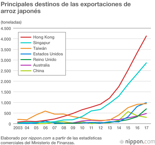 El principal destino de las exportaciones de arroz japonés en 2017 fue Hong Kong, que importó un total de 4.128 toneladas por un valor de 1.020 millones de yenes. Esto supone que, en comparación con la cifra de hace 10 años, el volumen se multiplicó por 12 y el valor por 6. En segundo lugar se situó Singapur, donde igualmente el volumen se multiplicó por 17 y el valor por 8. Las exportaciones a los Estados Unidos, Reino Unido y Australia también están creciendo paulatinamente. Pero se trata de países y regiones con mercados de gran poder adquisitivo donde el arroz a precio alto está ya disponible en los comercios minoristas, y hay una demanda que procede de clientes que quieren consumir un arroz delicioso procedente de Japón. Es difícil afirmar si estas exportaciones continuarán creciendo a gran velocidad en el futuro.