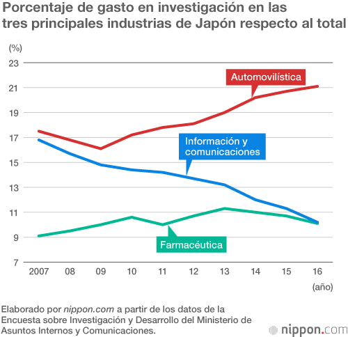 Detrás de la industria del automóvil se sitúan otras dos industrias principales: la dedicada a la información y comunicaciones con unos gastos de 1.357.200 millones de yenes y la farmacéutica con 1.351.600 millones de yenes, cada una de ellas rondando el 10 % del total. El gasto en investigación en estas industrias se han estancado en los últimos años, mientras que los de la industria del automóvil están creciendo de manera evidente.