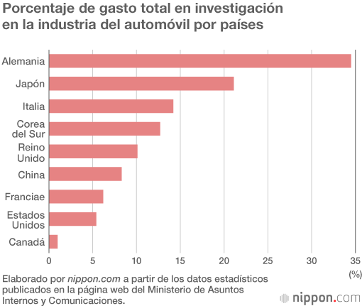 Alemania, conocida por empresas como Volkswagen o Daimler, domina la tabla de porcentaje de gasto en investigación en la industria automovilística en todo el mundo con un 34,5 %, quedando por delante de Japón, que muestra un 21,1 %. Les sigue Italia con un 14,2 % y Corea del Sur con un 12,7 %.