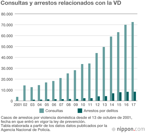 Según datos de la Agencia Nacional de Policía, en 2017 se produjo un aumento del 3,6 % en los casos de consultas relacionadas con la violencia doméstica hacia el cónyuge con respecto al año anterior, ascendiendo hasta los 72.455 casos, la cifra más alta desde que en 2001 dieran comienzo las políticas específicas para la prevención de este tipo de agresiones. 60.150 personas, un 83 % del total de las víctimas, eran mujeres.