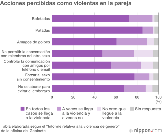 En ese mismo estudio, al mencionar acciones concretas y la posible conciencia de que se percibieran como violentas al darse entre la pareja (incluyendo aquí a los casados de facto y a las parejas que viven separadas), no eran pocos los encuestados que respondían “a veces llega a la violencia, y a veces no”, o “no llega a la violencia”, hablando de daño físico concreto (“me da bofetadas”, “me fuerza al sexo aunque yo no quiera”), pero también de acciones restrictivas (“no me permite hablar con gente del otro sexo”, “controla mis amistades, vigila mis emails y llamadas”). En cuanto a las posibles razones por las que no se llega a la violencia (podían dar varias respuestas), un 53,7 % aducía que “es algo que cae en la esfera del matrimonio”, un 29,2 % que “es algo normal en la pareja”, y un 14,4 % que “en pareja, es algo que hay que perdonarse”; muchas de las víctimas no son conscientes de serlo.