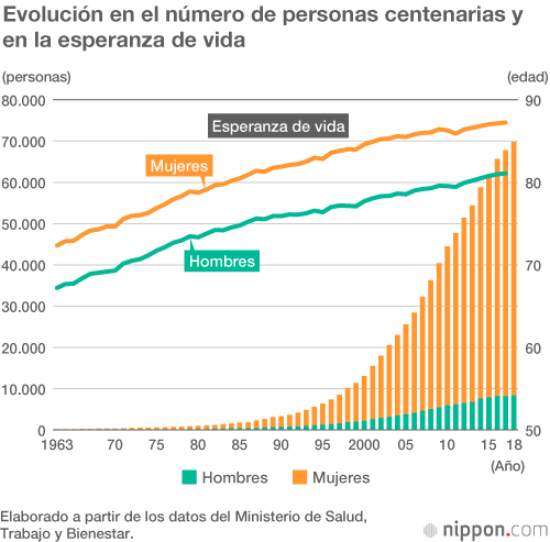 Datos del registro de residentes facilitados por el Ministerio de Salud, Trabajo y Bienestar revelan que a 15 de septiembre de 2018 el número habitantes de cien años o más en Japón creció en 2.014 personas con respecto al año anterior, alcanzando un total de 69.785. El número de personas de cien años o más ha crecido de forma ininterrumpida en los últimos 48 años, y en este grupo de población hay además una mayoría abrumadora de mujeres, que representan un 88,1 % del total.