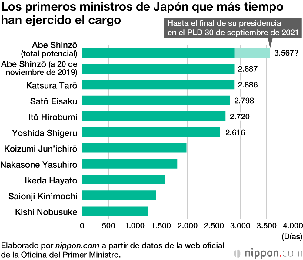 El actual mandato del primer ministro Abe como presidente del Partido Liberal Democrático no finalizará hasta el 30 de septiembre de 2021, y si continúa siendo el líder del Gobierno hasta entonces, habrá estado un total de 3.567 días en el cargo.