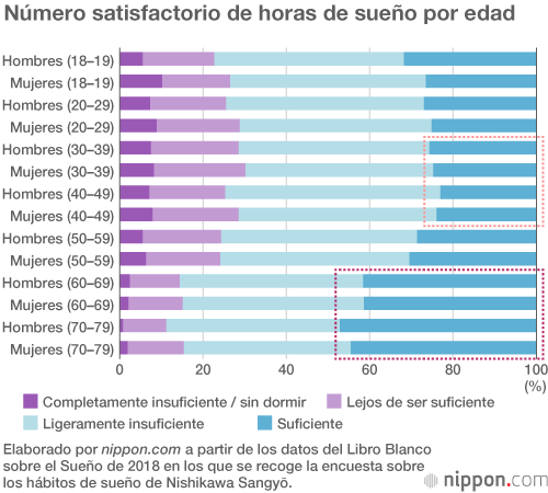 Al ser preguntados si dormían lo suficiente, los encuestados mostraron en sus respuestas grandes discrepancias dependiendo de la edad. Mientras que una notable cifra de personas de entre 60 y 79 años sentían que dormían adecuadamente, menos del 30 % de las personas en otros rangos de edad contestaron que dormían los suficiente. Un importante porcentaje de las personas de entre 30 y 49 años contestaron que, o bien no dormían lo suficiente o no podían dormir, lo que indica una clara insatisfacción respecto al número de horas que consiguen descansar.