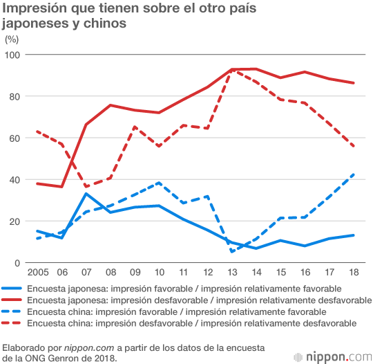 Una encuesta de 2018 reveló que la imagen de Japón ha mejorado considerablemente entre la ciudadanía de China. La encuesta de opinión conjunta entre los ciudadanos de China y Japón fue realizada en septiembre por la ONG Genron, un think tank independiente con sede en Japón, y el Grupo Editorial Internacional de China. Un 42,2 % de los chinos afirmaron tener una imagen “favorable” o “relativamente favorable” de Japón, más de 10 puntos por encima del 31,5 % registrado en la encuesta del año anterior. Por otra parte, un 56,1 % contestó que tenía una imagen “desfavorable” o “relativamente desfavorable”, 10 puntos por debajo del 66,8 % reflejado en la encuesta de 2017.