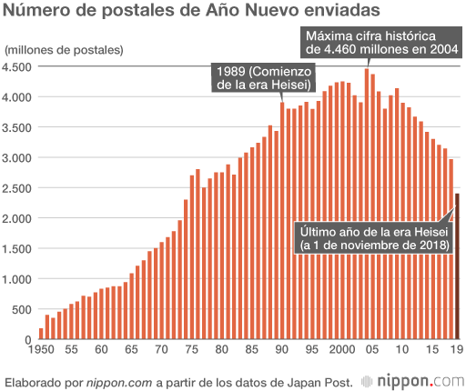 A 1 de noviembre de 2018 Japan Post emitió 2.400 millones de postales de Año Nuevo (nenga hagaki), un descenso del 7,2 % respecto al mismo día de 2017 (más tarde pueden ser emitidas más de estas postales dependiendo de la demanda). El número de postales emitidas alcanzó su máximo histórico en 2004 con 4.500 millones, pero ha ido reduciéndose desde entonces. Con la proliferación de los teléfonos móviles, algunas personas empezaron a optar simplemente por llamar para felicitar el Año Nuevo, mientras que en los últimos años un creciente número de personas han renunciado a esta costumbre y envían sus buenos deseos a través de las redes sociales en su lugar. El próximo Año Nuevo será el último de la era Heisei puesto que el Emperador abdicará el 30 de abril de 2019 tras 30 años en el trono. Se espera que el número de postales que se envían sea el más bajo de todo su reinado.