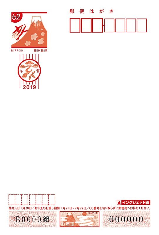 Cada año las postales de Año Nuevo de Japan Post ofrecen una gama diferente de diseños originales. Para 2019, el año del jabalí, tendrá un sello impreso con un jabalí subiendo el monte Fuji, y un matasellos que mostrará un motivo de pinos y bambú diseñado de tal forma que se parecerá al carácter para dicho animal (亥). Este mismo carácter se puede ver en la parte baja de la postal donde se encuentra impreso el número de lotería.