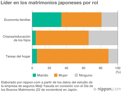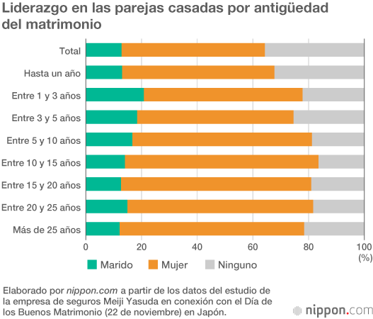 Un estudio de la empresa de seguros de vida Meiji Yasuda revela que en un 51,6 % de los matrimonios japoneses es la esposa la que manda. En contraste, los maridos ostentan el mando en solo un 12,8 % de los matrimonios. El estudio también destaca que las mujeres suelen llevan la batuta independientemente de la antigüedad del matrimonio: suele ser así tanto en parejas recién casadas hace menos de un año como para matrimonios longevos con más de 25 años.